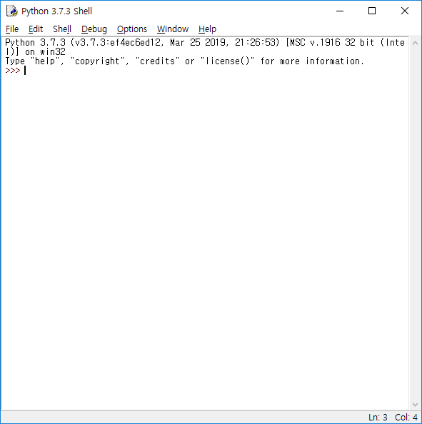 - 시작 메튜에서 IDLE을 실행합니다. IDLE에서 Python x.x.x 버전 명을 확인 할 수 있으면 설치가 잘 된 것입니다.