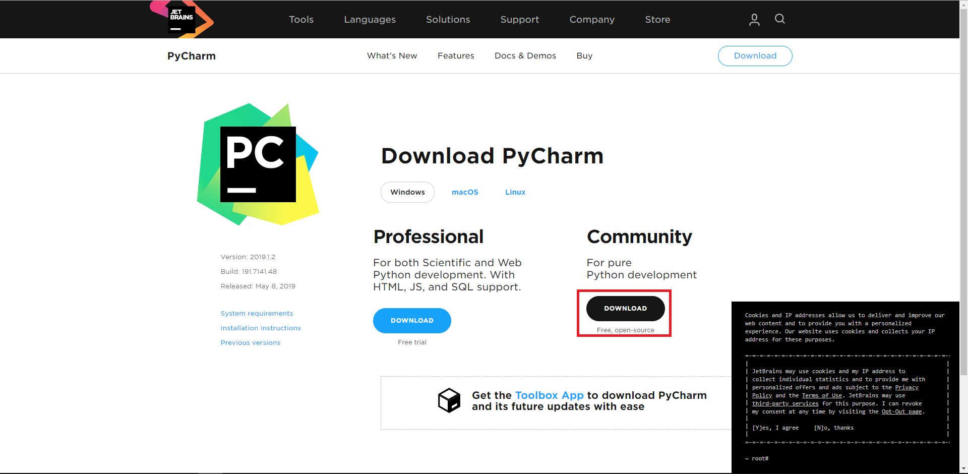 - https://www.jetbrains.com/pycharm/download/ 페이지에 접속해 무료인 Community 버전의 검정색 DOWNLOAD 버튼을 클릭합니다.