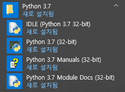 - 시작 메뉴에서 파이썬 관련 프로그램들을 확인할 수 있습니다.