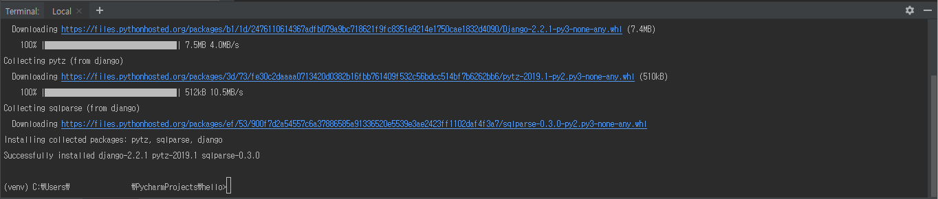 장고 설치는 금방 완료됩니다. 다만 프로젝트를 만들 때마다 장고를 설치할 것입니다.