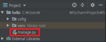 위의 명령을 입력할 때 주의 할 점은 config 다음에 한칸을 띄우고 .(점)이 있다는 것입니다. 이 점은 '현재 폴더에 파일들을 만들겠다'라는 의미입니다. 장고 프로젝트를 만들면 config 폴더가 생기고 manage.py 라는 파일이 만들어 집니다.
