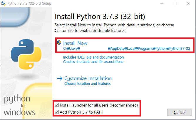-Install launcher for all users (recommended)와 Add_Python version to PATH를 체크하고 Install Now를 클릭합니다.