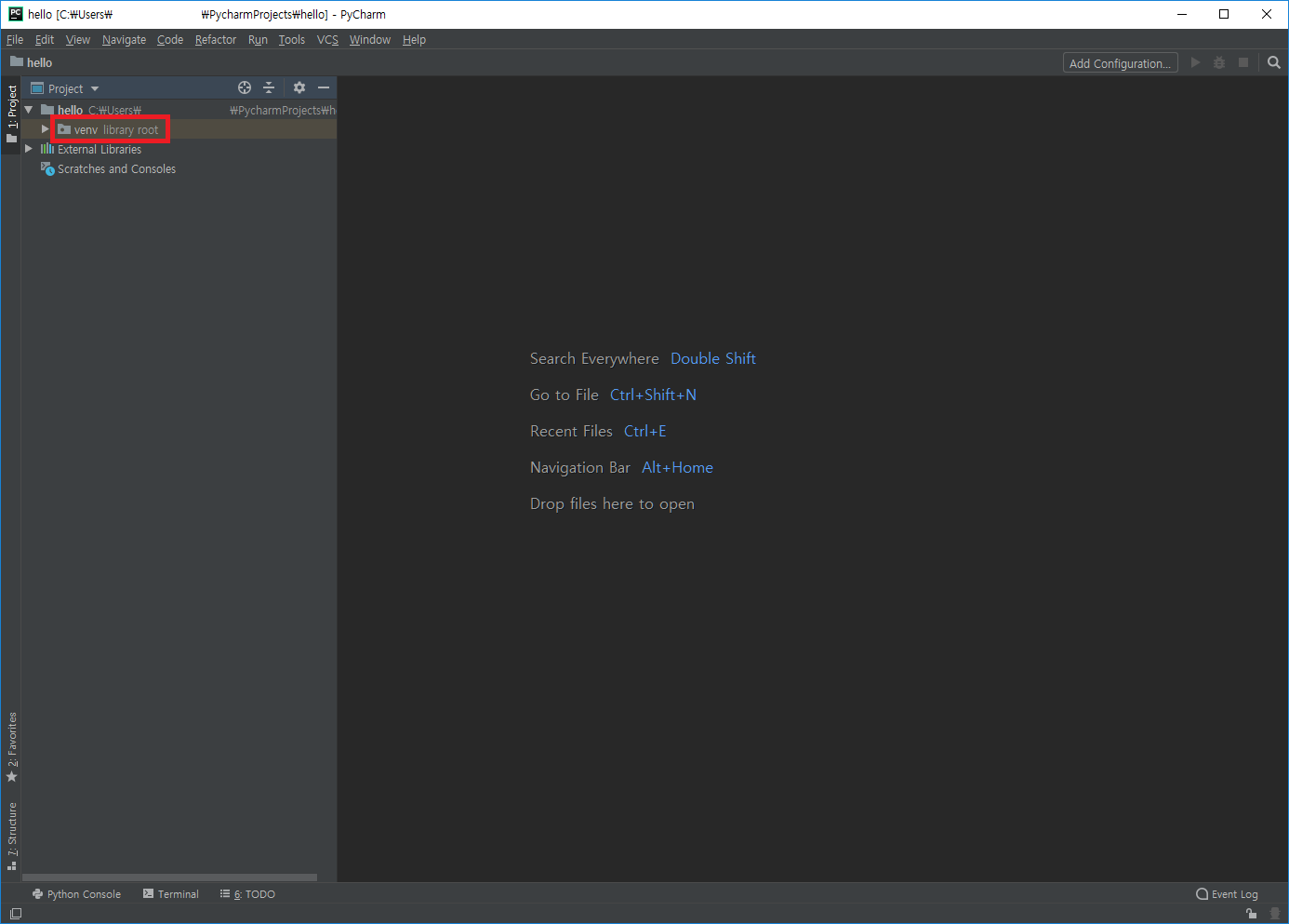 - 파이참 로딩이 끝나면 Welcome to PyCharm 창이 나타납니다. 이 화면을 보고 있다면 설치가 잘 끝난 것입니다.