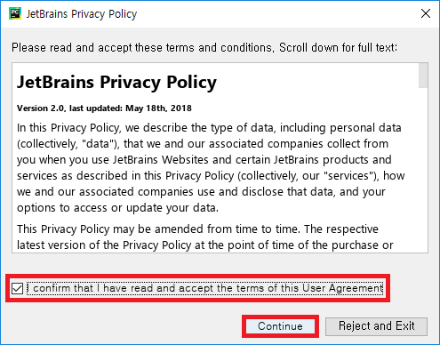- I confirm that I have read and accept the terms of this User Afreement를 체크하고 Continue 버튼을 클릭합니다.