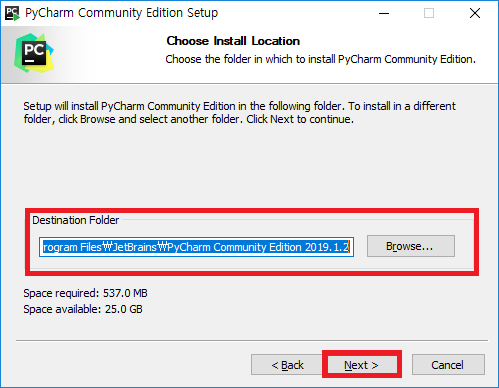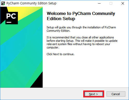 - 다운로드 완료된 python-versionpycharm-community-2019.1.2.exe 설치 프로그램을 실행합니다.