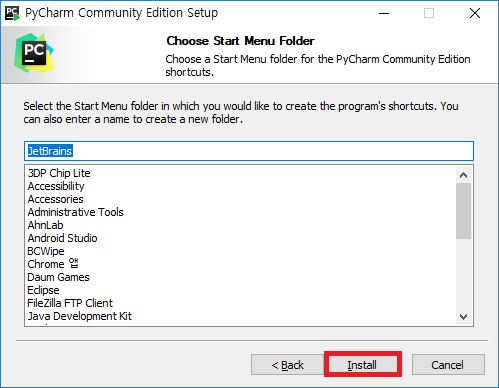 - 시작 메뉴 폴더 구성을 선택하고 Install 버튼을 클릭합니다.
