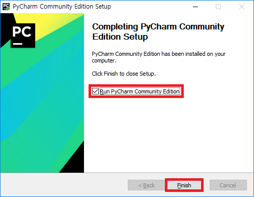 - 설치가 완료되면 Run PyCharm Community Edition을 체크하고 Finish 버튼을 클릭합니다.
