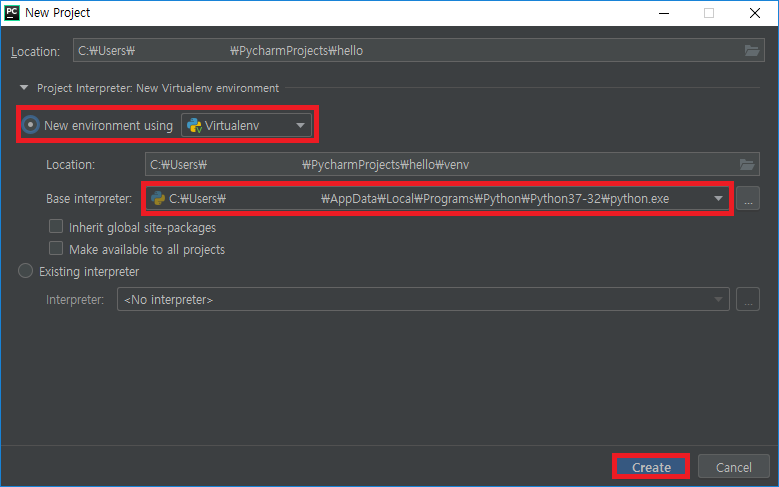 - 가상 환경을 보기 위해 Project Interpreter를 클릭합니다. 가상 환경은 다양한 파이썬 버전과 모듈 버전을 사용하고 싶을 때 각각의 버전별 환경을 분리해서 사용하는 것을 의미합니다. 이 책에서도 앞으로 프로젝트마다 별개의 가상 환경을 설정해두고 사용할 것입니다. New environment using를 선택하고 설정들을 확인 합니다. Location은 프로젝트 폴더 밑에 venv 폴더로 설정하고 Base interpreter는 파이썬 3.7 버전으로 선택하면 됩니다. 보통은 기본값으로 두고 바꾸지 않아도 됩니다. 설정을 다 확인 했으면 Create 버튼을 클릭합니다.