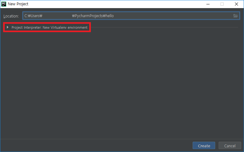 - 프로젝트 만들기 창이 나타납니다. 이 창에서 Location 부분에 선택되어 있는 untitled에 원하는 프로젝트명으로 변경한 후 가상 환경 설정을 살펴보겠습니다.