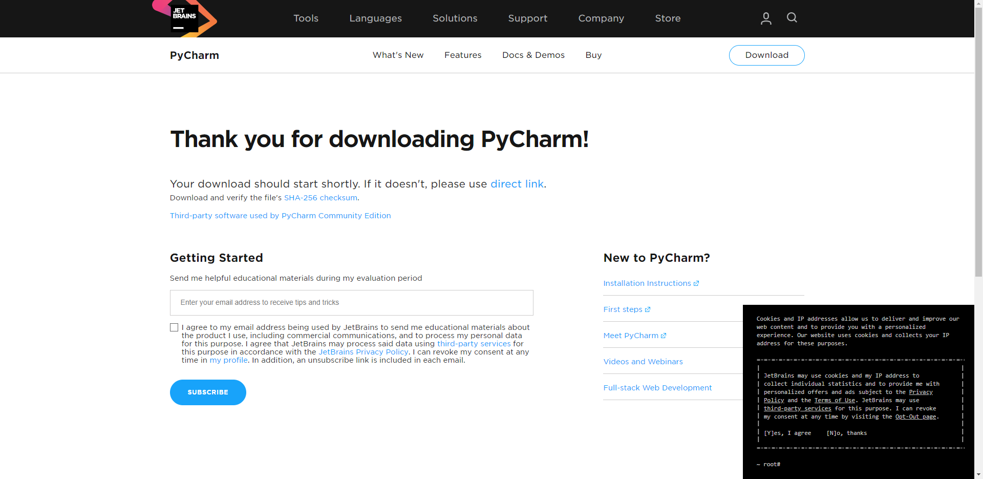 - 설치 파일 다운로드가 시작되면 안내 페이지에서 메일링을 신청할 수 있습니다. 파이참 제작사의 메일링을 받고 싶다면 등록하시면 됩니다.