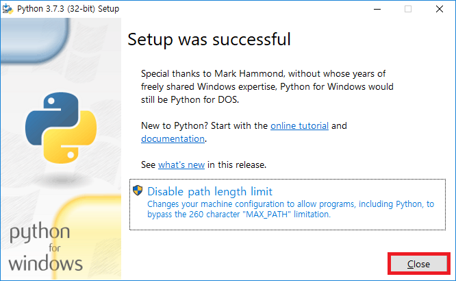 - 설치가 완료되면 Close 버튼을 클릭합니다.