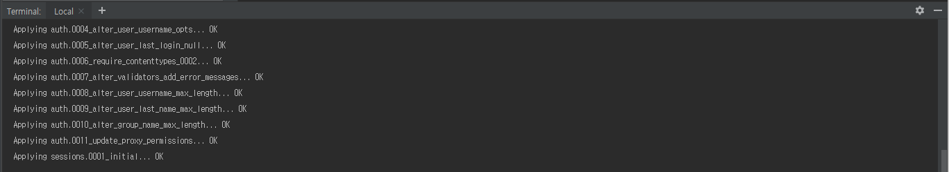 위의 명령을 입력해 DB를 초기화 하면서 DB 파일을 생성합니다. 아래의 화면처럼 장고가 여러가지 일을 처리하면서 DB를 만들고 초기화 합니다.