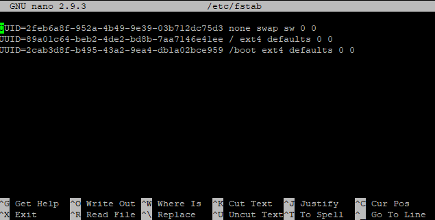 - sudo nano /etc/fstab