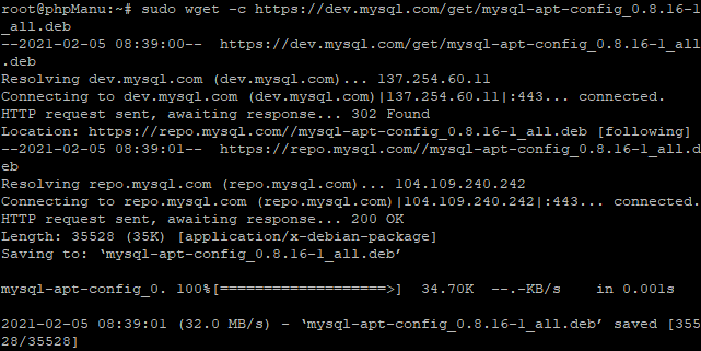 - sudo wget -c https://dev.mysql.com/get/mysql-apt-config_0.8.16-1_all.deb