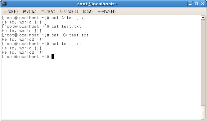 리다이렉션 기호가 하나일 경우(>)에는 무조건 파일을 만들어 내고, 기호가 둘이 되면(>>) 기존의 파일에 추가